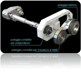 Prelevando il moto con una puleggia motrice sulla parte posteriore del madrino, siamo in grado di montare un albero telescopico di proporzioni dimensionate ai lavori più duri esegubili su questo tipo di macchine monomandrino. Inoltre, con la medesima scatola portautensile, l'utilizzatore può facilmente passare dalla poligonatura alla fresatura di filetti e viceversa, semplicemente sostituendo la puleggia condotta montata con l'altra puleggia data in dotazione.