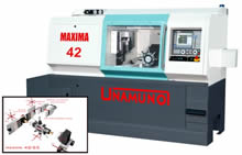 La gama ‘Maxima’ (Versión B) de tornos Multi-Carro dispone de 2 tamaños de base de máquina y 2 capacidades de cabezal. Las máquinas incorporan un carro superior con 3 ejes con capacidad para 6 herramientas, de las cuales 3 pueden ser motorizadas. Todas las máquinas de la gama instalan un carro con torreta de 8 estaciones. Las máquinas de 42mm disponen también de 2 ejes en el carro de la torreta y movimiento en el eje Z para la 2ª operación para permitir el trabajo simultáneo de la 2ªop. y del cabezal principal. En el modelo de máquina de 36mm en la parte inferior del cabezal hay un carro con 2 ejes de gran rigidez.